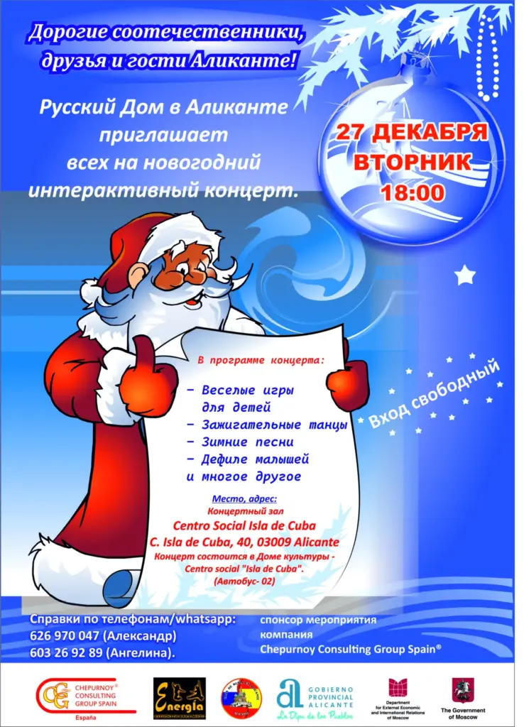 Уже совсем скоро куранты пробьют двенадцать раз и начнут отсчитывать минуты нового 2023 года. Уходящий год был непростым, со своими проблемами, печалями и радостями. Одной из таких радостей стал праздничный новогодний концерт для детей, организованный и проведенный силами Ассоциации «Русский Дом в Аликанте» и прошедший во вторник 27 декабря в местном доме культуры Isla de Cuba, города Аликанте.
