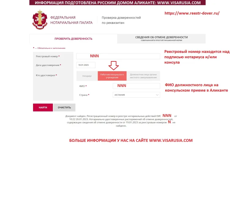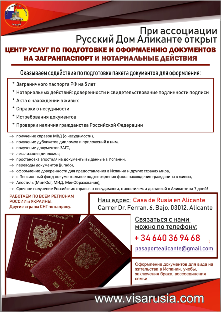 При Русском Доме Аликанте открыт Центр услуг, в котором граждане Российской Федерации могут оформить и получить новый ЗАГРАНПАСПОРТ НА 5 и 10 лет, а также ОФОРМИТЬ ДОВЕРЕННОСТИВсе доверенности вносятся в Единую информационную систему нотариата Российской Федерации.